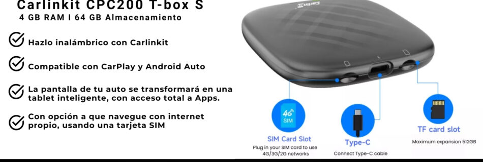 El Carlinkit T-Box Lite es la opción ideal para quienes quieren una solución simple y accesible para usar CarPlay y Android Auto de forma inalámbrica en su pantalla original. Está diseñado para ofrecer lo esencial: conexión estable, compatibilidad con la mayoría de radios y un sistema ágil para navegación y música sin necesidad de cables. A diferencia de los modelos T-Box S y T-Box Plus, el Lite no incluye GPS integrado, por lo que depende del GPS del teléfono, funcionando perfecto para quienes buscan algo práctico, rápido y sin complicaciones. Es la elección perfecta para mejorar tu experiencia diaria sin requerir funciones avanzadas ni instalar múltiples aplicaciones.
